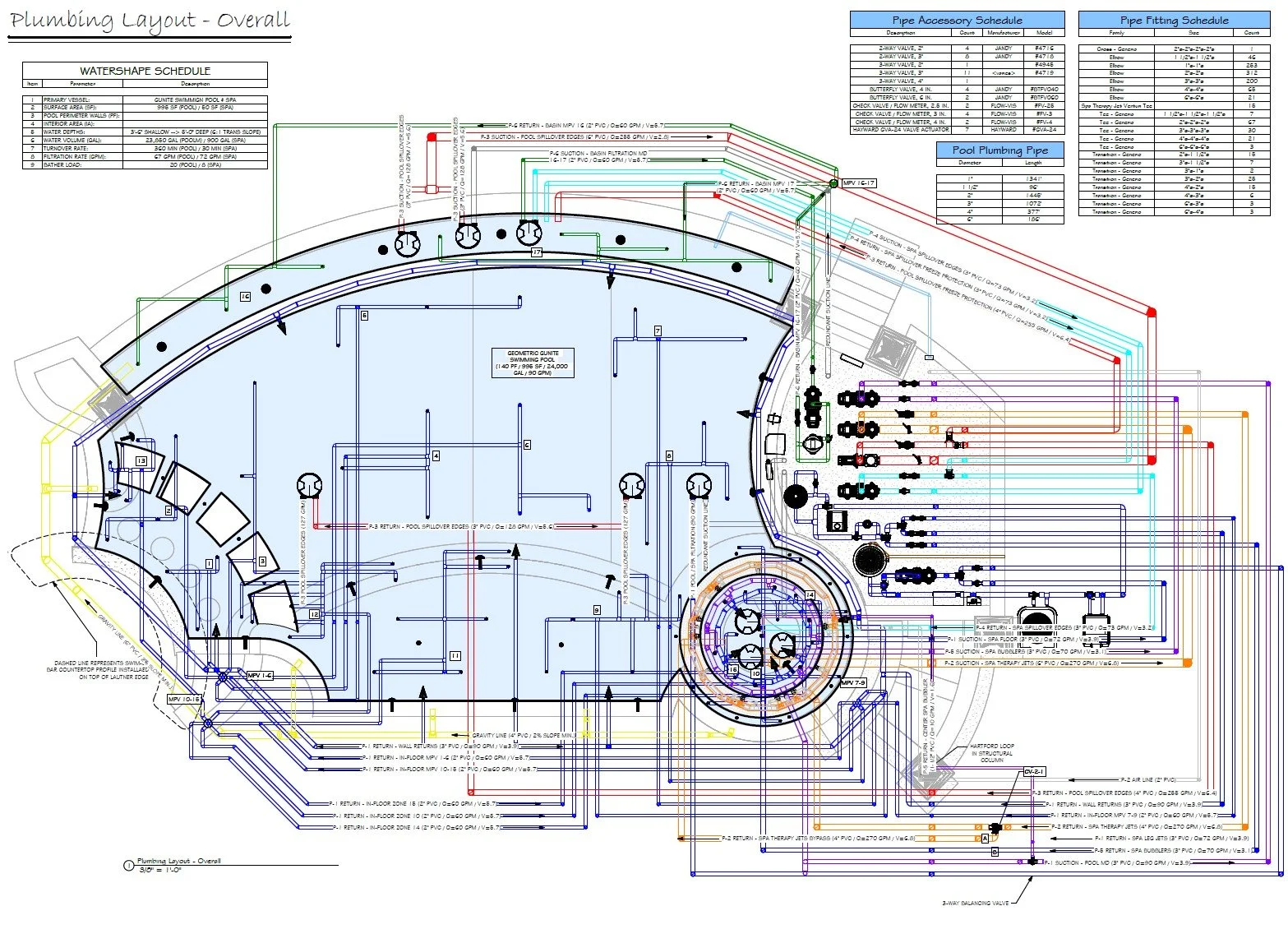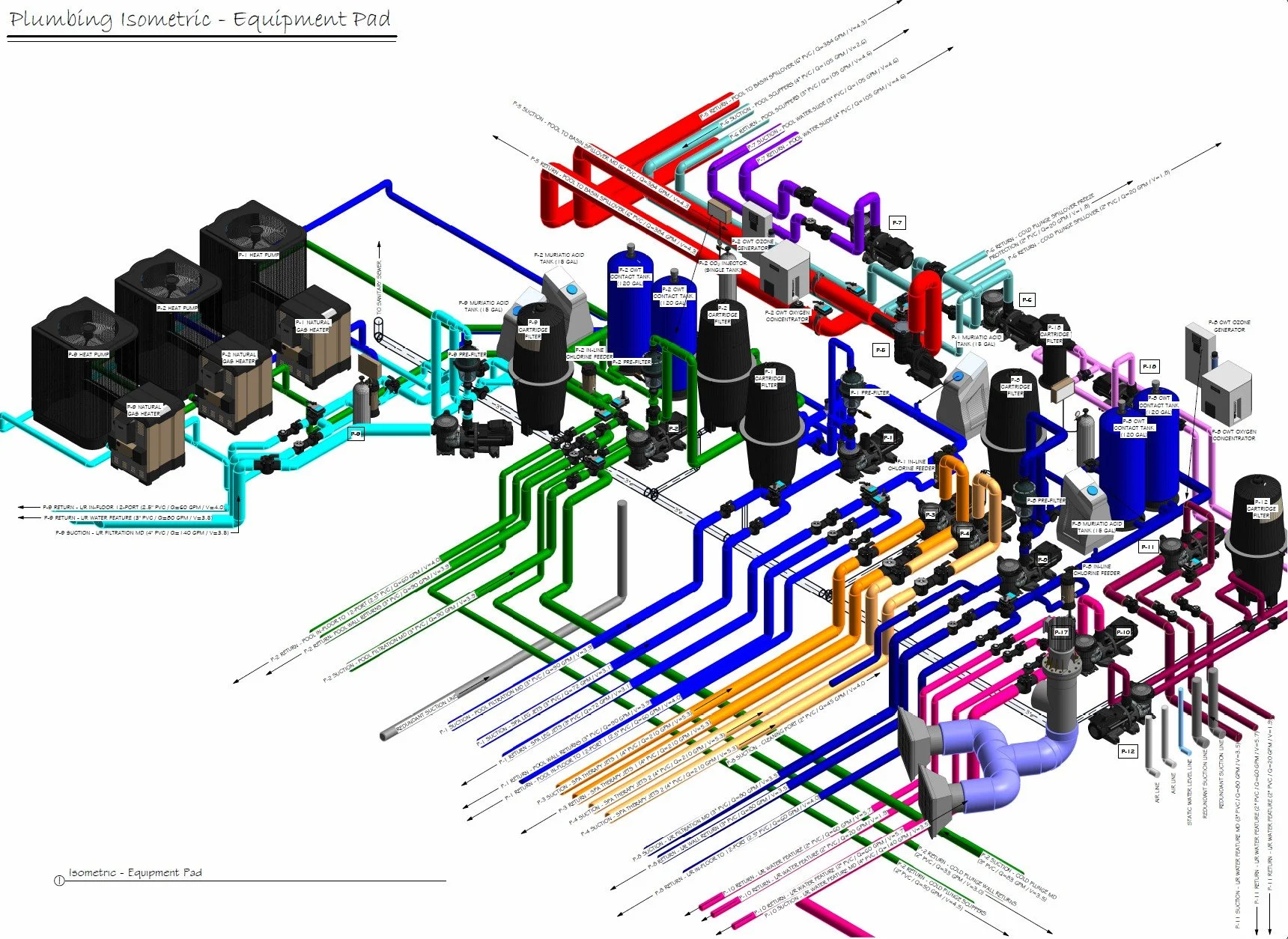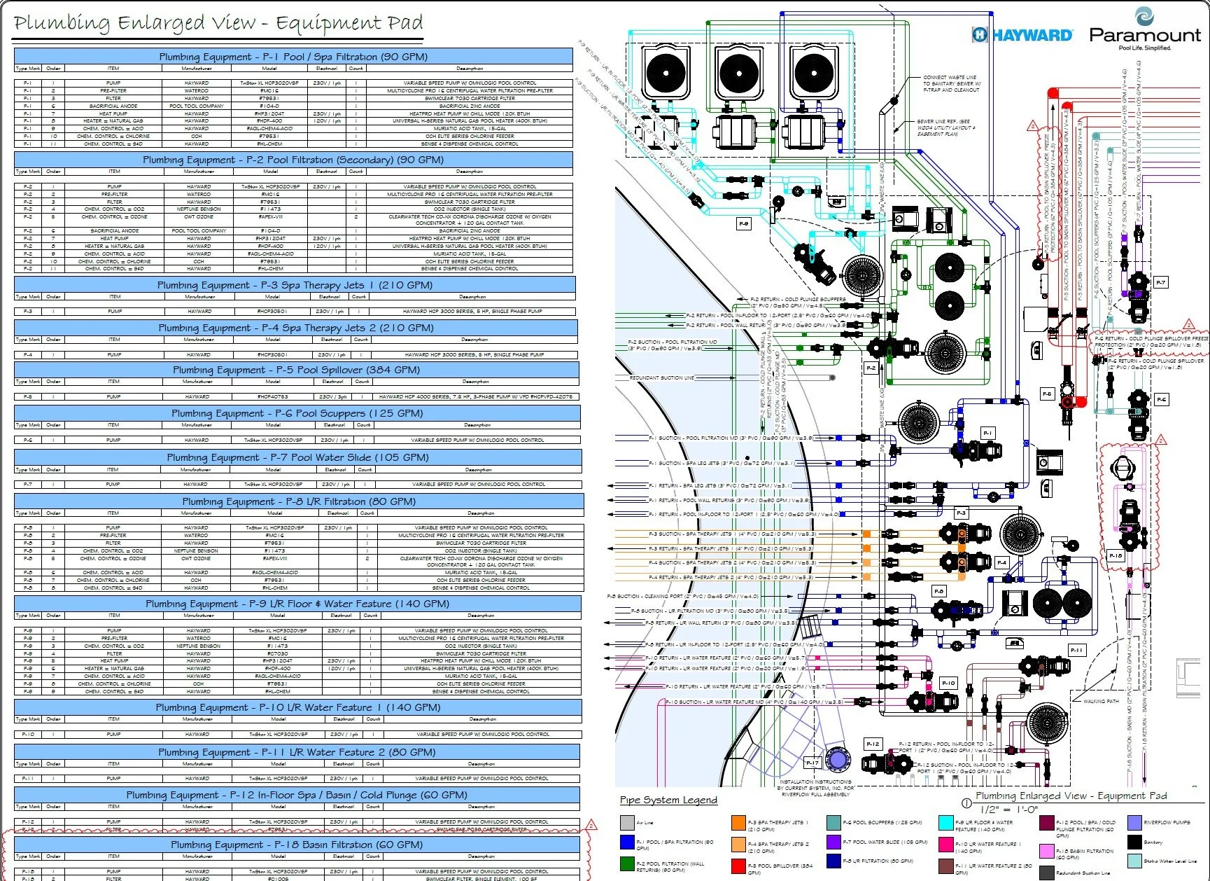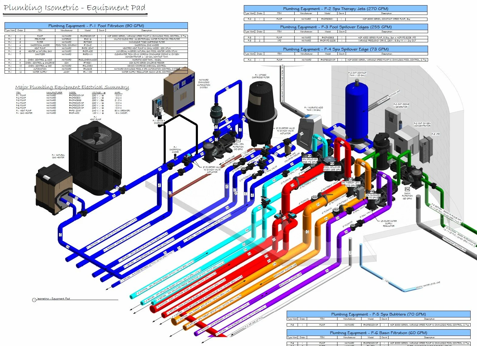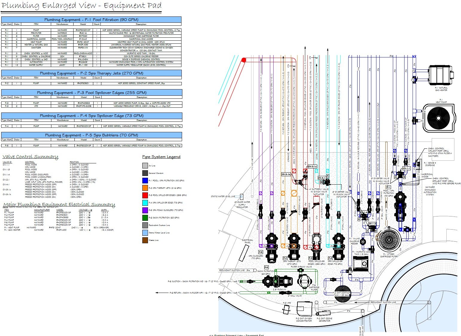 Schematic Pool Equipment Pad Layout (Specified Equipment, Pad Plumbing, Data Charts, Details)